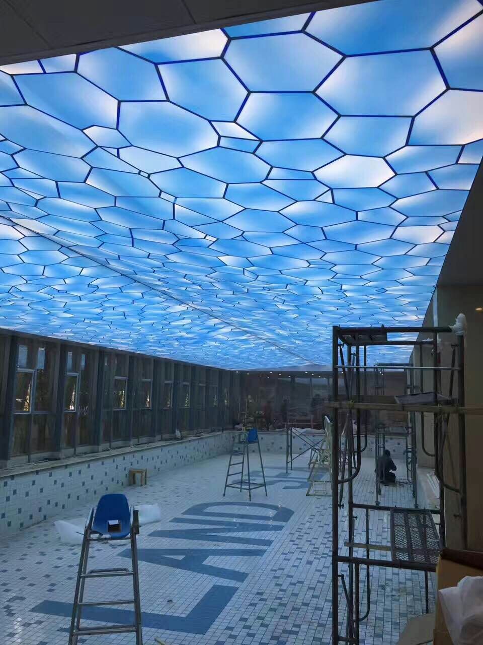 軟膜天花由于防水,防濕,防潮等特點,被廣泛用于浴場,大型游泳池等場所,被廣大設計所運用,造型新穎,圖案多樣,可朔性非常高,而且易更換,清洗.